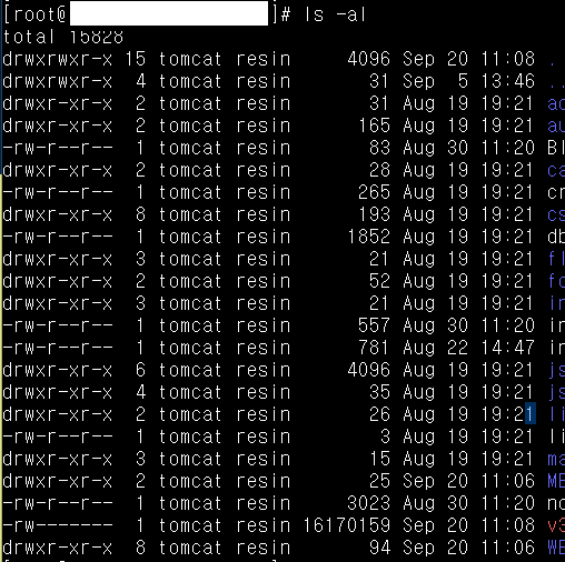 tomcat계정으로 기동되어 있었고, 소스는 resin resin 계정의 소유권으로 지정되어 있었다.