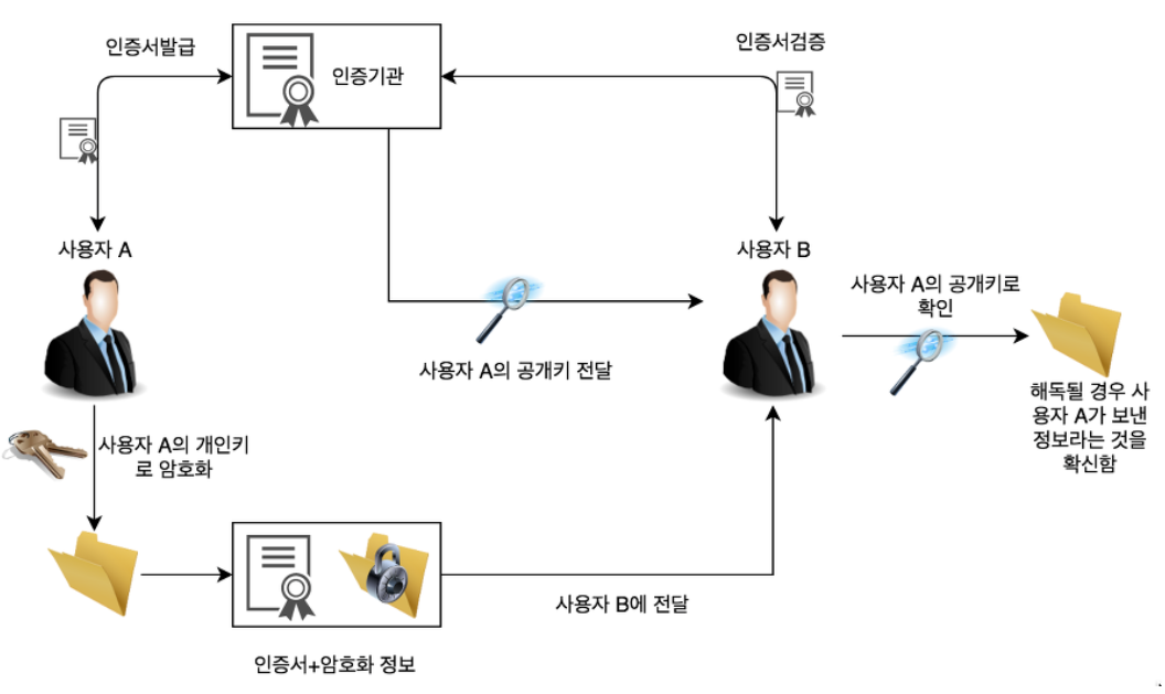다만, 중간과정에서 C라는 공격자가 B인척하고 자신의 공개키로 메시지를 전송하게 됬을 때 만약 A가 속는다면… 문제가 생길 수 있다. 이런 공격을 막기 위해 공개키를 인증할 수 있는 방법이 필요한데 그게 바로 ‘인증서’가 된다.