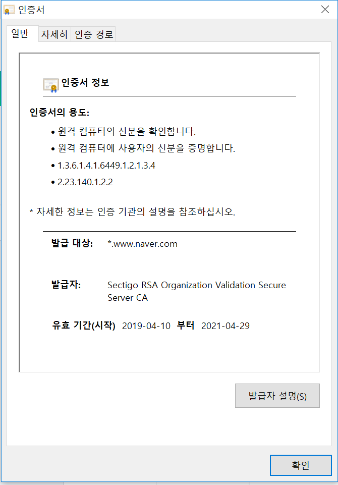 예시 이미지) 네이버에서 사용하는 인증서의 만료일 확인