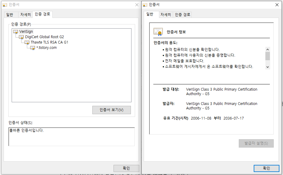 * 인증서확인 방법 : URL 옆 자물쇠모양 클릭.